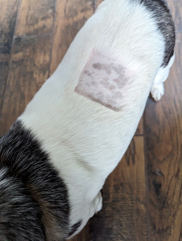 One amusing discovery is the area the vet shaved for his injection. Bruce is a little white dog with black markings, but underneath the white fur is speckled skin. This shaved spot makes me think of packaging that has a window to reveal the contents to the shopper, like a box of macaroni that lets you see the noodles within. Here, we see the contents of the little white dog package is actually a speckled pup!