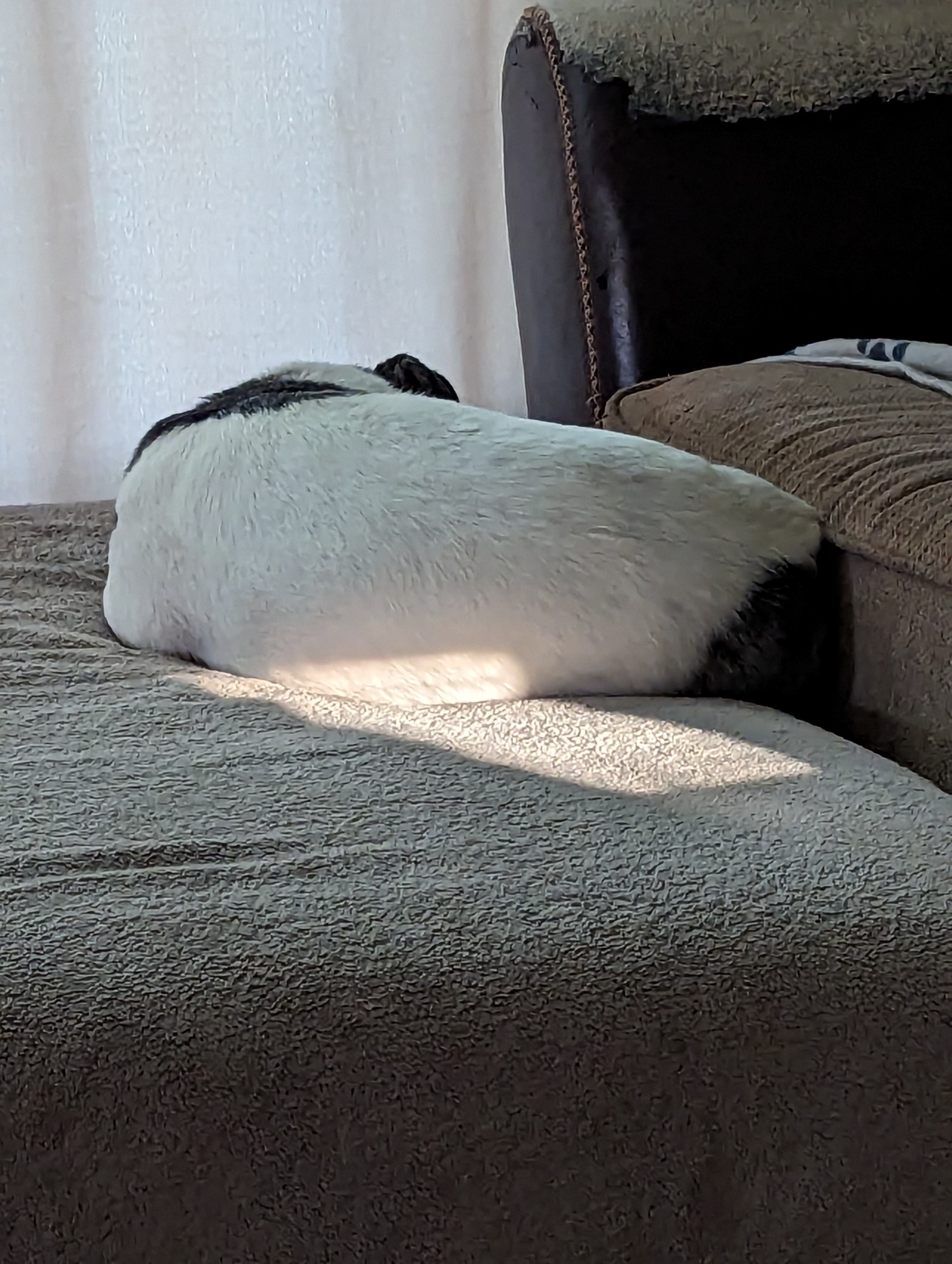 One amusing discovery is the area the vet shaved for his injection. Bruce is a little white dog with black markings, but underneath the white fur is speckled skin. This shaved spot makes me think of packaging that has a window to reveal the contents to the shopper, like a box of macaroni that lets you see the noodles within. Here, we see the contents of the little white dog package is actually a speckled pup!