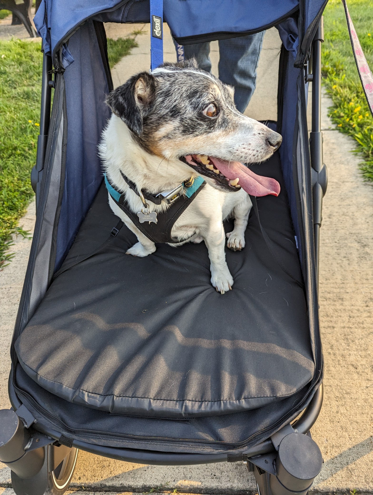We have resumed walking Bruce after dinner, but we are limiting the distance he walks as he is only two weeks out from his first round of heartworm injections. We are still walking the full route, so Gidget gets some exercise, but we are putting Bruce in a stroller halfway through.