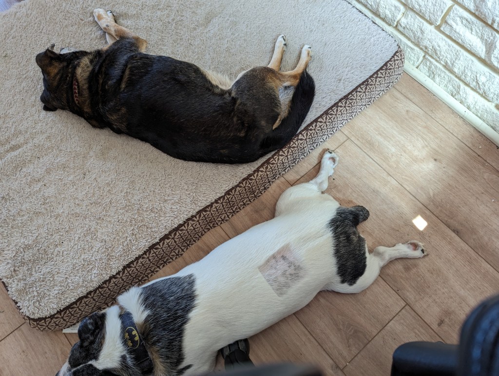 Bruce Wayne is twitchy as ever, although his steroid dose is low enough that he is no longer vibrating. He returns to the vet next week for his second round of heartworm treatment, and I expect he will be back on the high-dose steroids following the visit.