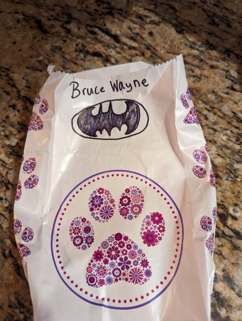 Bruce Wayne had another round of injections for his heartworm treatment. For the second round, he went to the vet on two consecutive days and received injections on both days. The poor little guy had to stay at the vet all day both days, but he was far from neglected. He is a little cuddle bug, and the vet techs took turns holding him like a roly-poly teddy bear during the day. Someone even decorated the bag containing his medications.