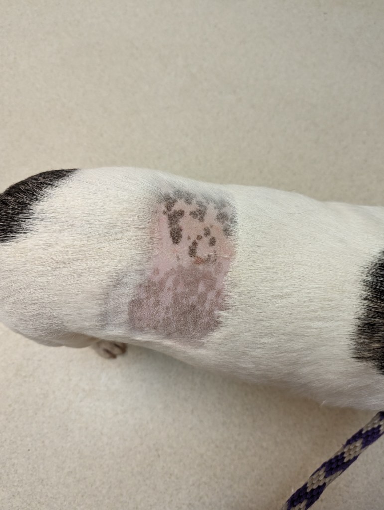 When the vet shaved his back for the injection last month, they only shaved the left side, and I noticed his speckled skin underneath. This time, they shaved both sides of his lower back, and I noticed that the speckles on the side they previously shaved were much darker than the speckles on his newly shaved skin. After a moment of pondering, I realized that the previously shaved area had received sun exposure for a month, darkening the speckles just like freckles in the sun. Now he is a two-toned speckled pup.