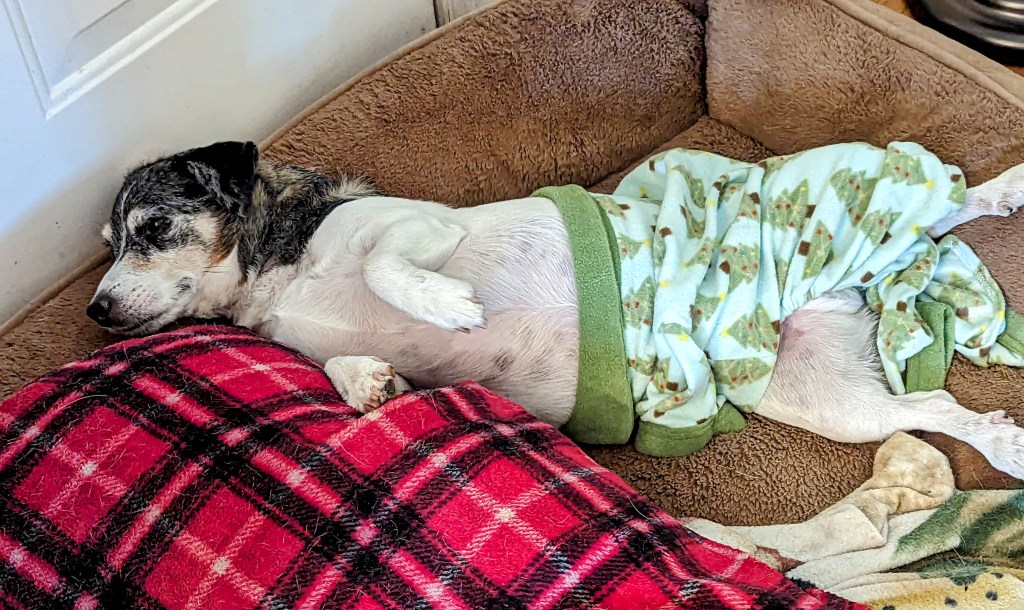 It’s chilly and damp in Michigan this morning, and I Bruce was burrowing into the blankets on his chair like he was cold. My guess is the naked skin on his back must feel especially chilled since it is newly naked. To combat his chill, I dressed him in his Christmas pajamas because I don’t know where I stored his little sweater when I packed things away in the spring. He does not seem impressed by playing dress-up today.