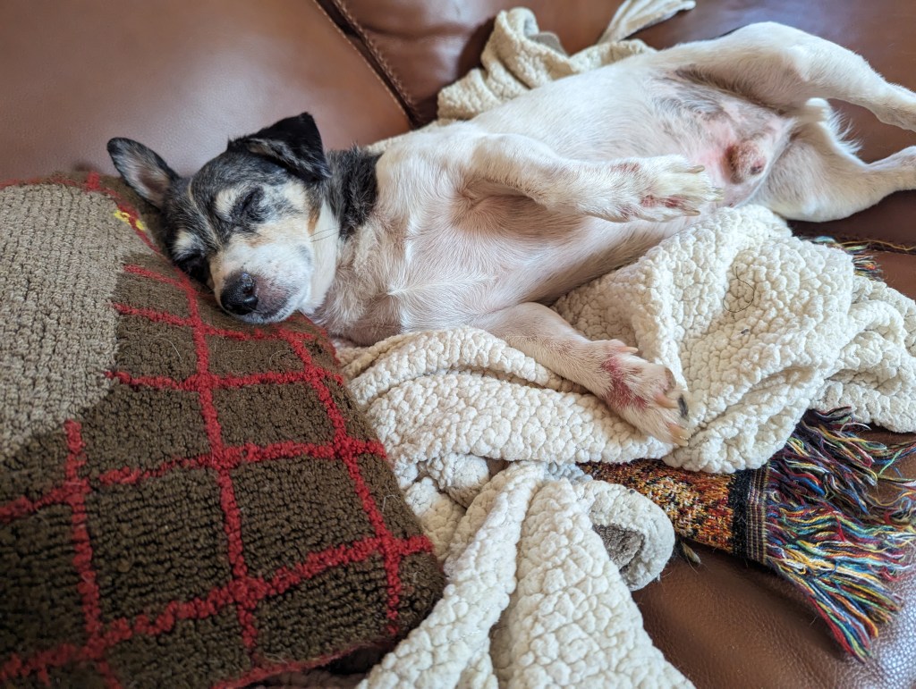 Bruce was happy to be reunited with us when we got home.  After he ran around the house and yard to make sure everything was the way he left it, he enjoyed a nap in his favorite spot.