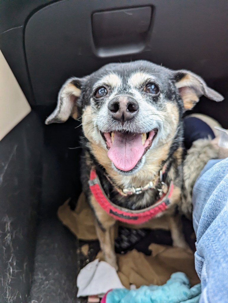 We take Gidget McFidget with us on these trips.  Last year, we brought Bruce Wayne, but this year we decided to leave him in the care of a trusted friend.  Bruce is in the final portion of his heartworm treatment, and the chaos of traveling might be too much stimulation for the little guy.  Plus, I knew I was going to have a left heart catheterization during this visit, and that would limit my ability to help Jay with walking the dogs, leaving him to handle both dogs by himself.