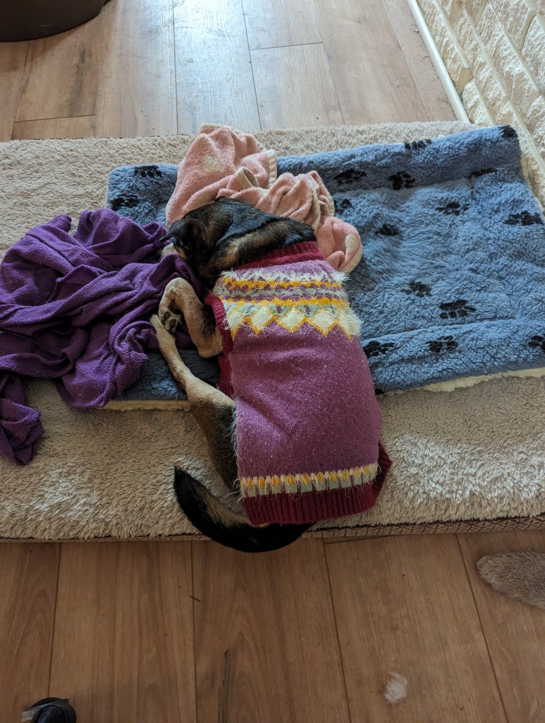 Sometimes, the fireplace isn’t enough to keep a pupper warm. Sweater weather!
