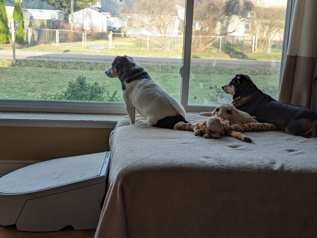 Since Gidget and Bruce are both senior dogs, I try to make their lives easier. Last week, I purchased a little ramp to help them get to their favorite viewing area atop the ottoman. No need to strain themselves while they guard the neighborhood from squirrels and delivery trucks.