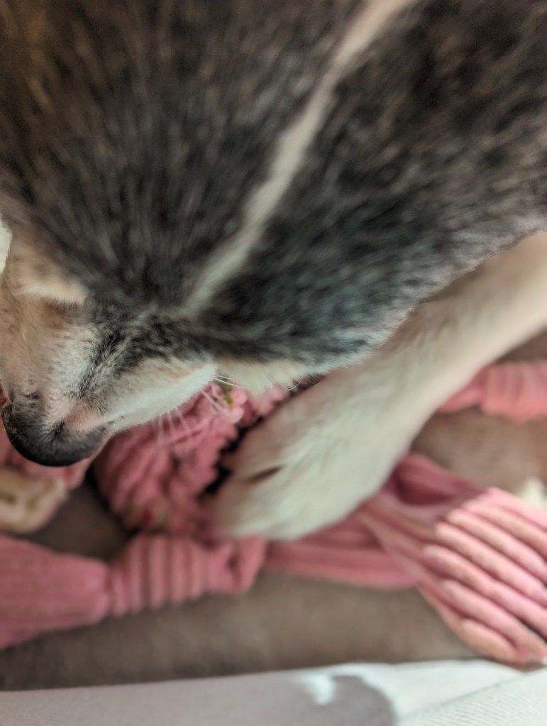 Bruce has shown some artistic talent recently, remodeling the pink tug bunny into a model with no squeaker and no head.